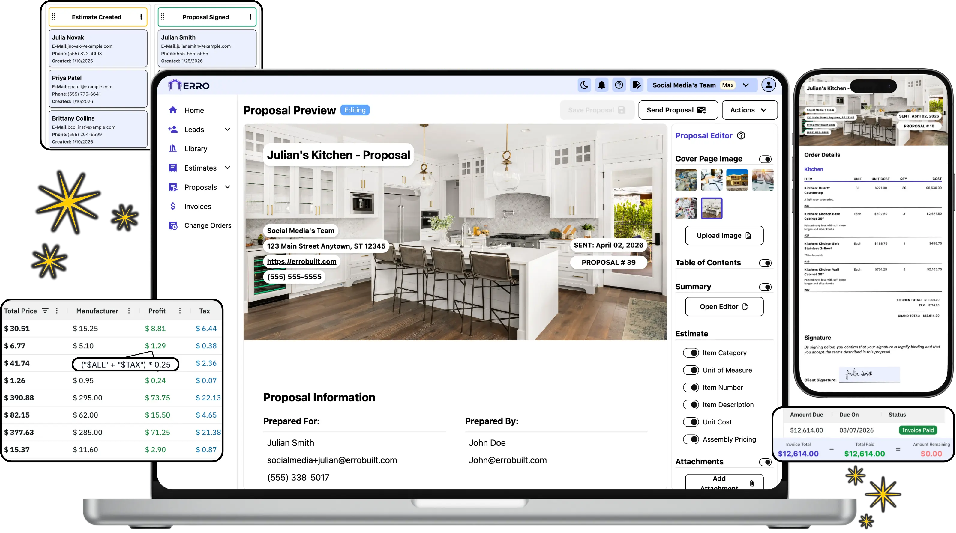 Pricing your custom products and services shouldn't require a PhD in spreadsheets. Erro gives you the power to manage and adjust profit, expenses, and taxes for every item — all directly in your item library. Make your estimates smart, fast, and effortlessly accurate.