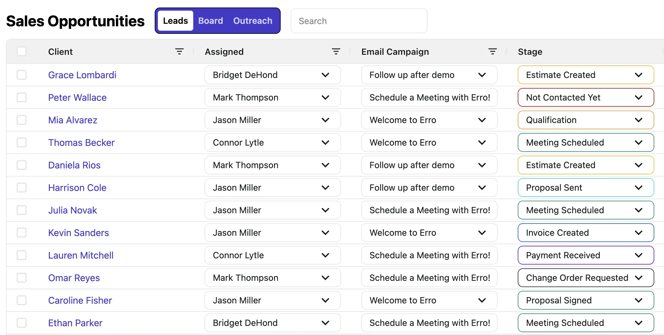 From leads to invoices, Erro keeps your team aligned. Built-in CRM and project management tools help you track clients, assign tasks, and stay updated on every job.