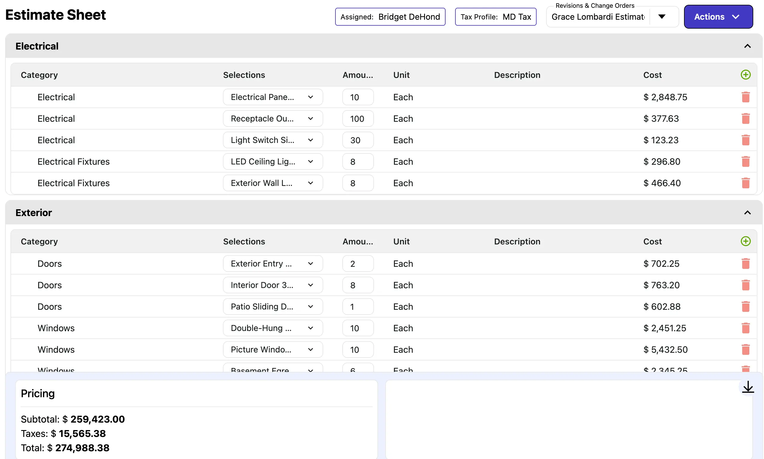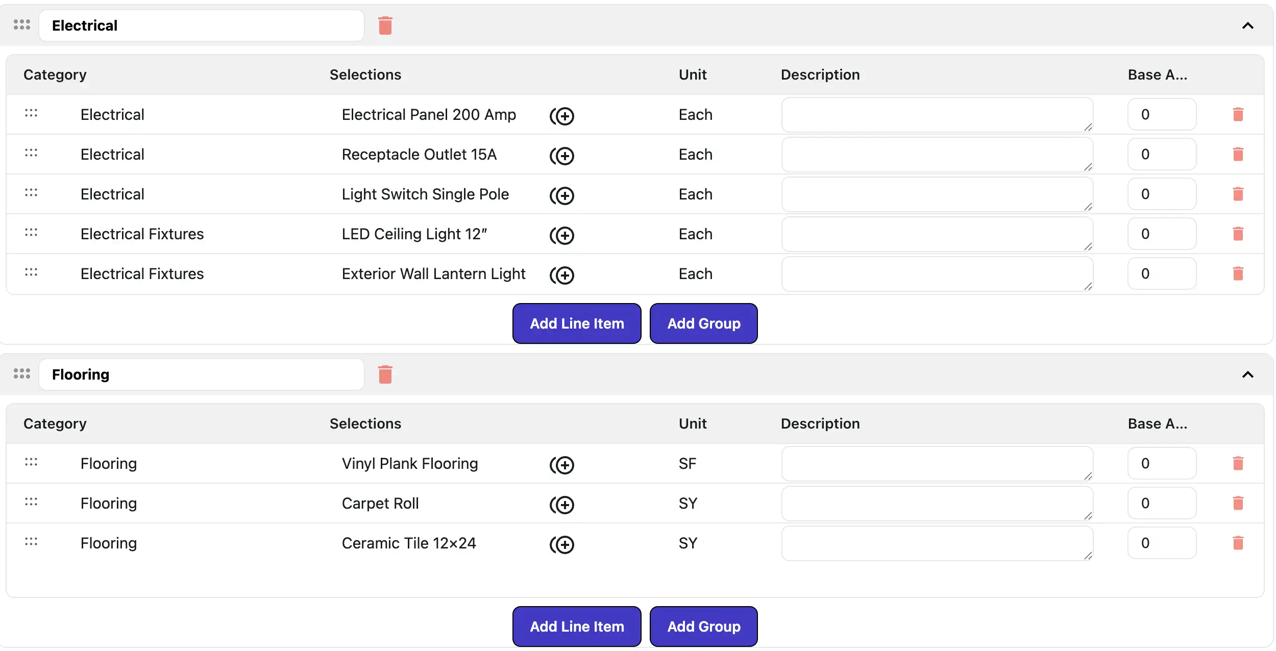 Support multiple pricing approaches within the same estimate. Choose between flat base pricing, optional add-ons, or detailed line-item pricing depending on how you sell.