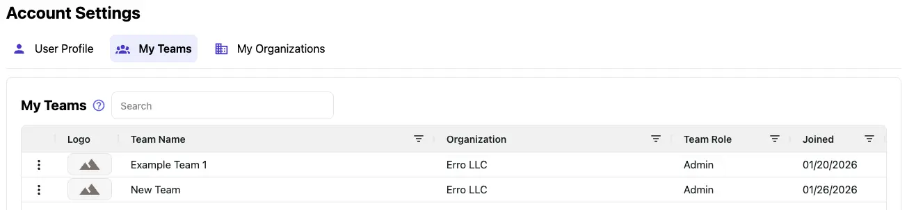 Clicking the 'My Teams' tab within the Account Settings will allow you to view and manage your team memberships. It shows you all teams you are a member of in a grid and provides basic details of each.