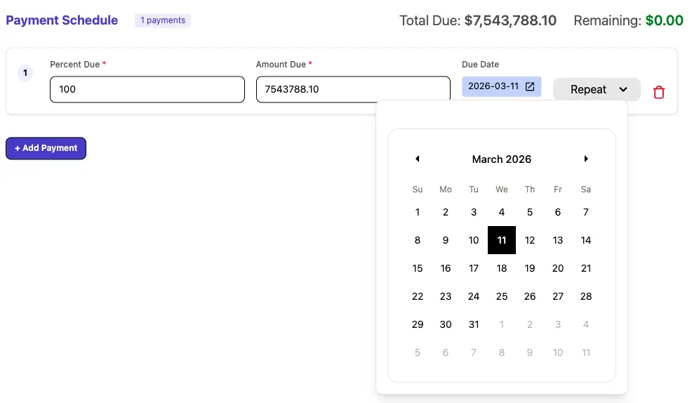 Enter either the payment amount or the percentage of the total invoice amount for this installment. Then, set the due date for when this payment is expected to be made.