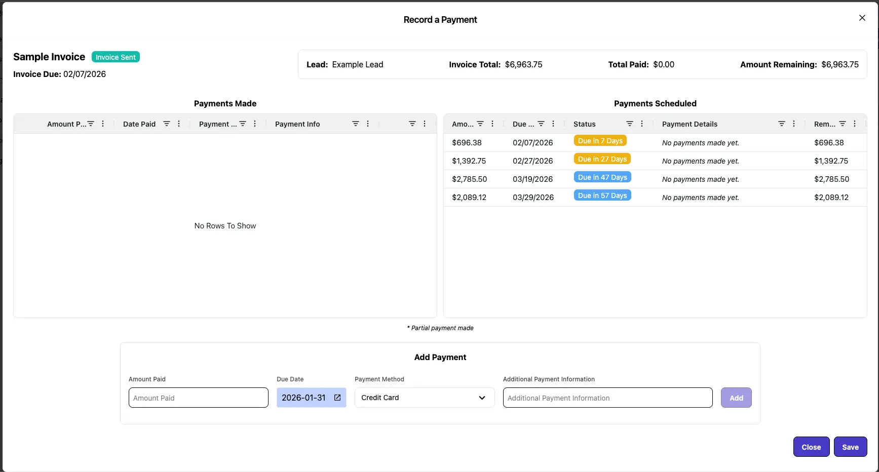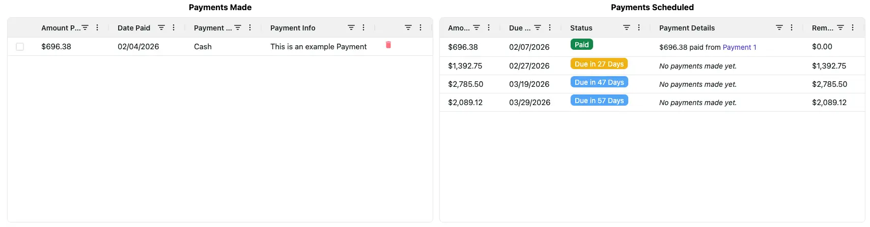 After recording a payment, the Payment Tracker will automatically update the invoice to reflect the new payment. The Payment will be added to the 'Payments Made' section on the right, and the 'Payments Scheduled' section will adjust accordingly.