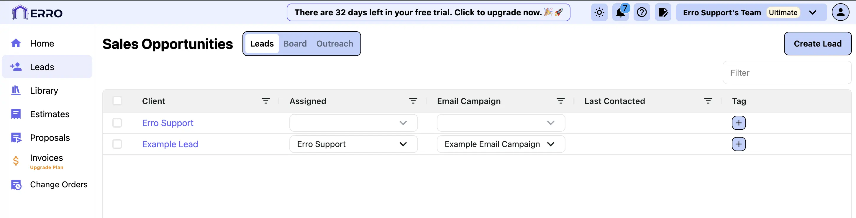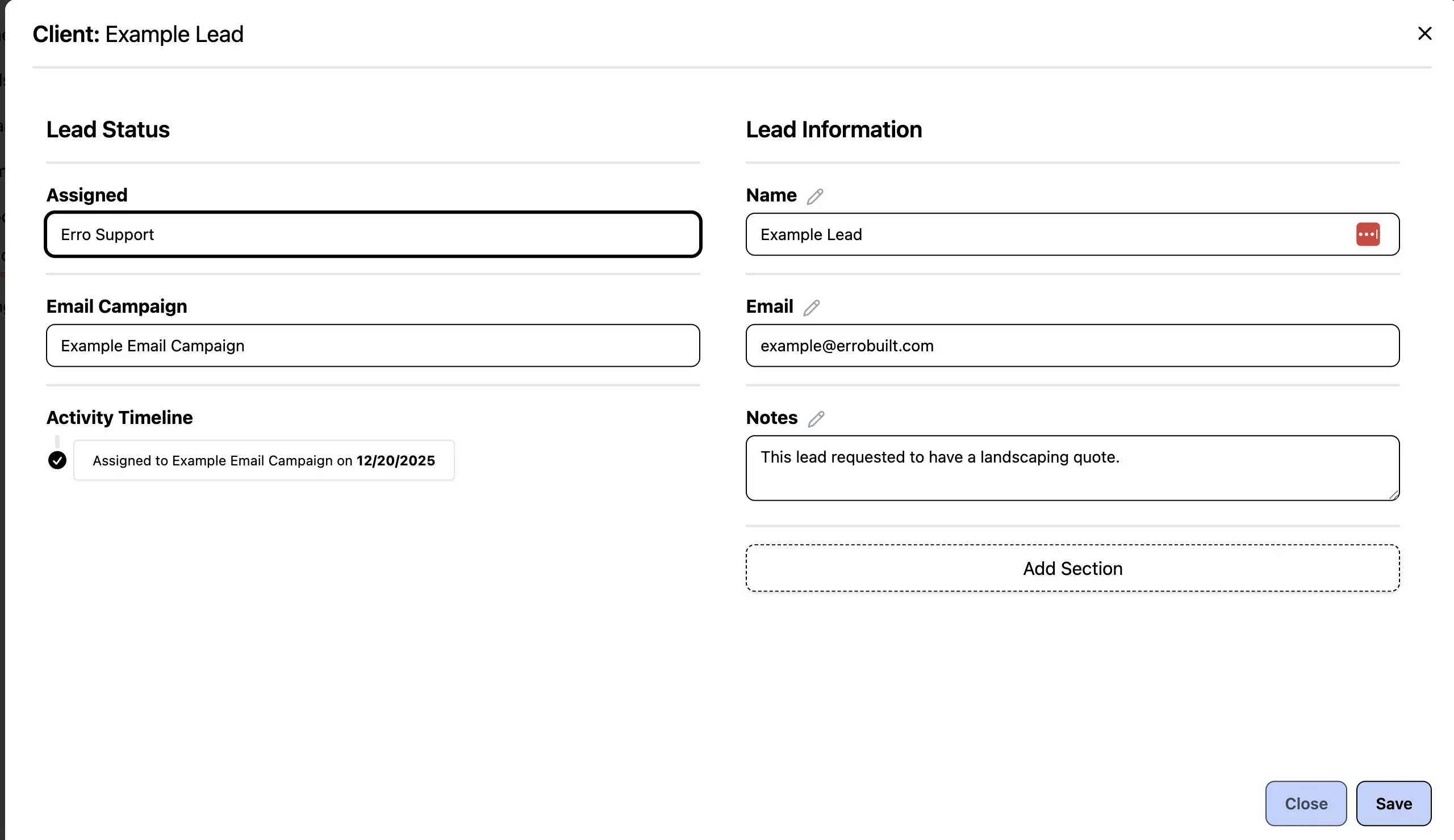 In this lead details page you can update any information such as name, contact information, and source as well assign a salesman or email campaign to the lead.