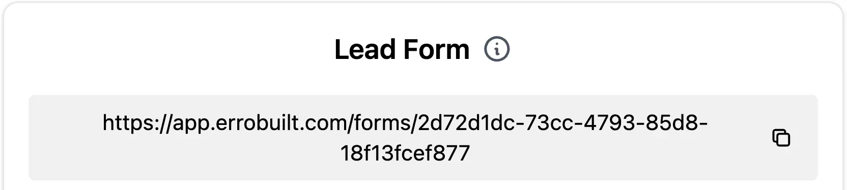 Start by going to the leads page, switching to the 'Outreach' tab, and clicking url to copy the lead form link. This is the URL you will use to share your lead form or embed it on your website.