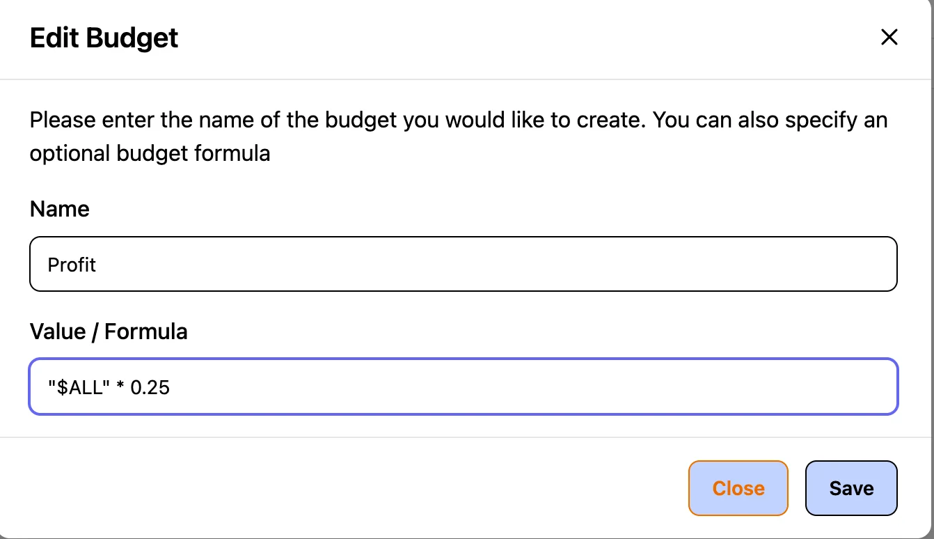 Click the three dots next to the Profit column and select Edit. Updating the formula here applies the change to all items in the column. Example: To apply a 25% profit margin, change the formula shown from ("$ALL" * 0) to ("$ALL" * 0.25). The final pricing will automatically update based on the margin you set.