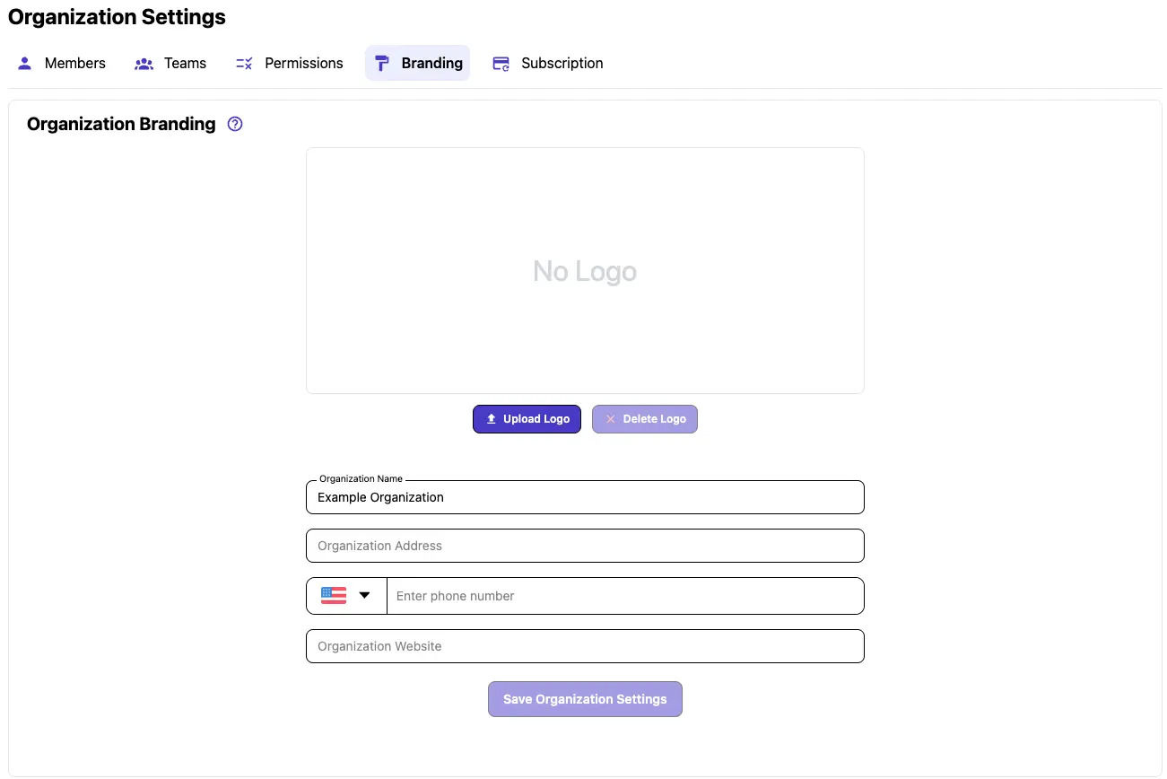 To add your own logo or business image to the organization, click the 'Upload Logo' button and select an image file from your device. This will automatically update the logo across the entire application.