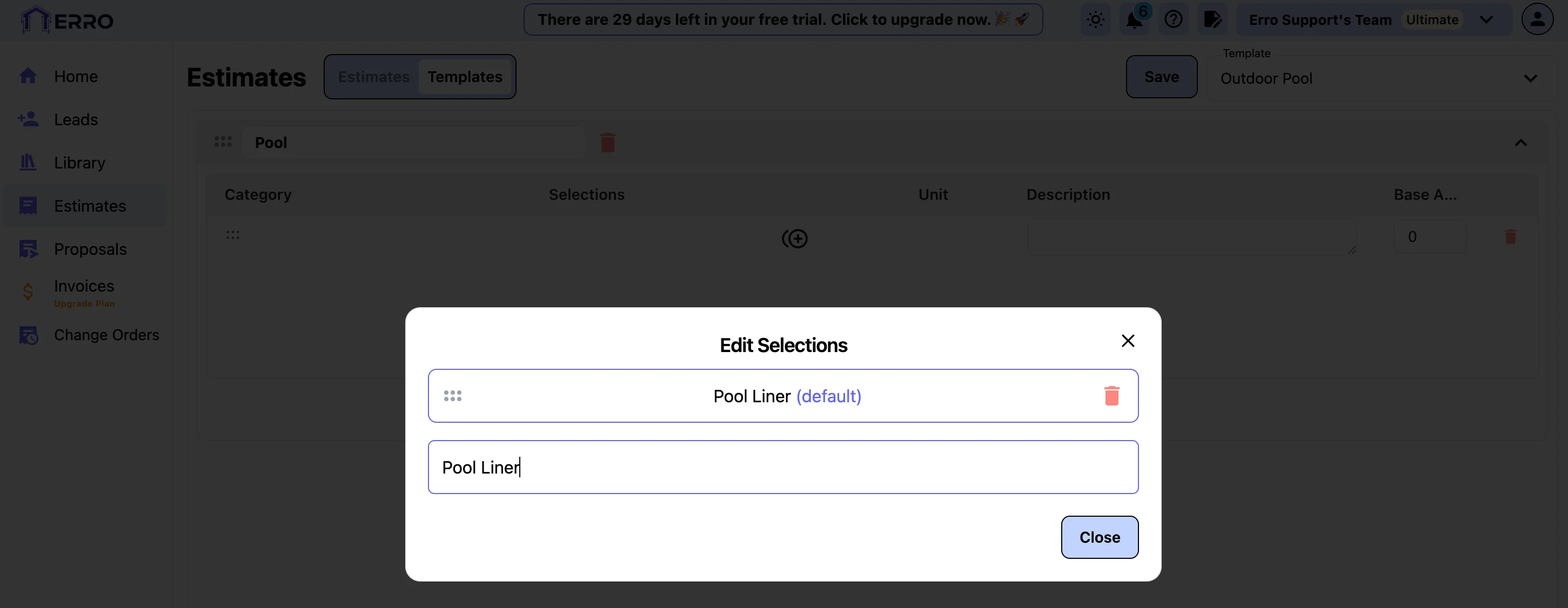 Go to the Estimates page and switch to the 'Template' tab. Click on the drop down under template enter a name and press 'Add'.